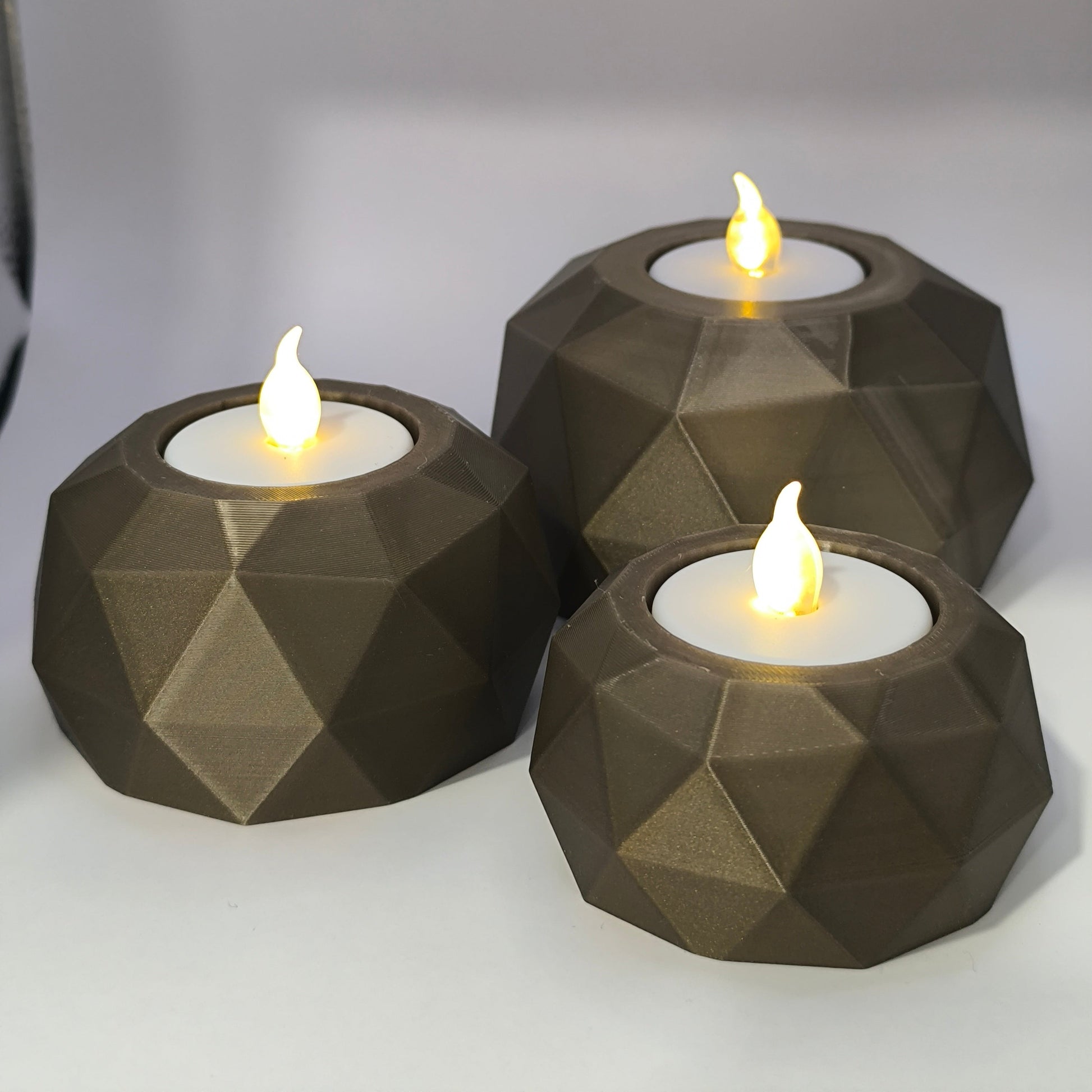 A Szett Tartalma: 3 db Polygon LED mécsestartó (S, M, L) + 3 db vibráló lánghatású LED teamécses (készen a használatra) + 3 db elemmel(CR2032).